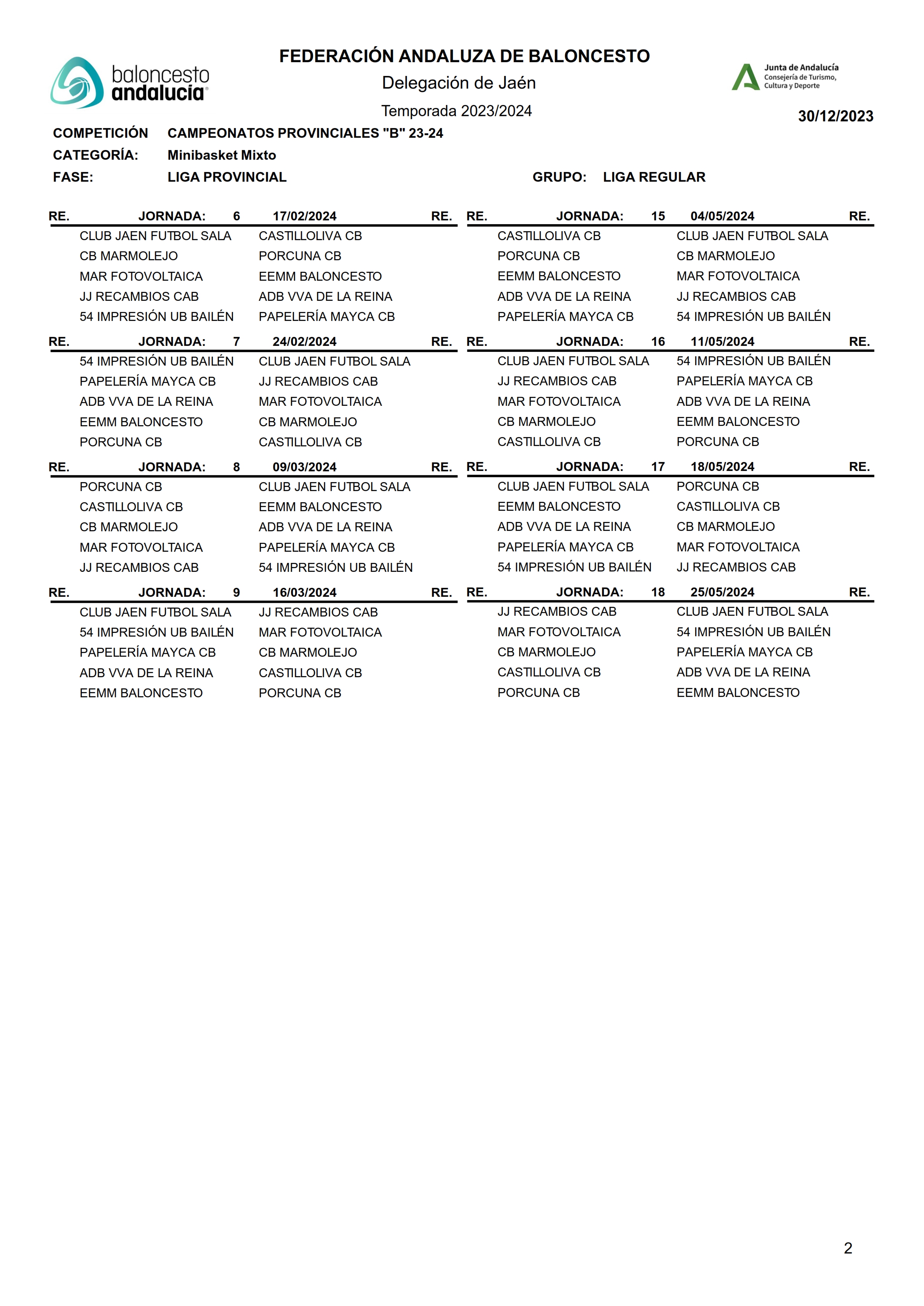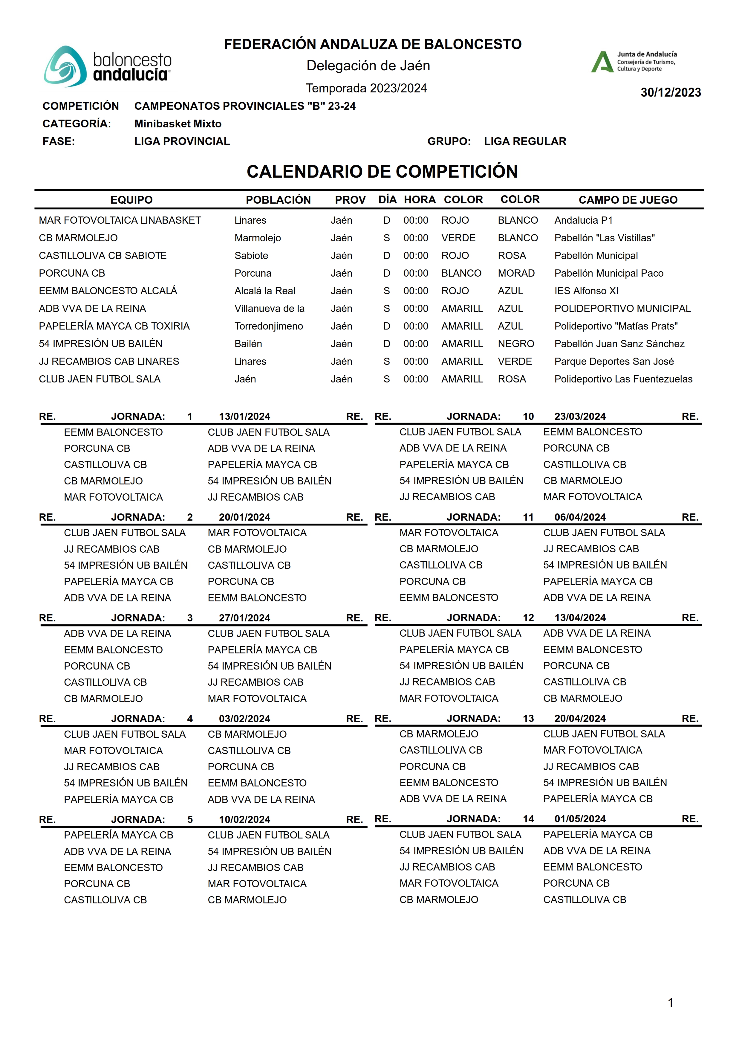 Calendario Liga Provincial Minibasket Mixto 23/24 webmaster Categoría: Calendarios 2023/2024 30 Diciembre 2023 Visitas: 799 Facebook X Anterior Siguiente