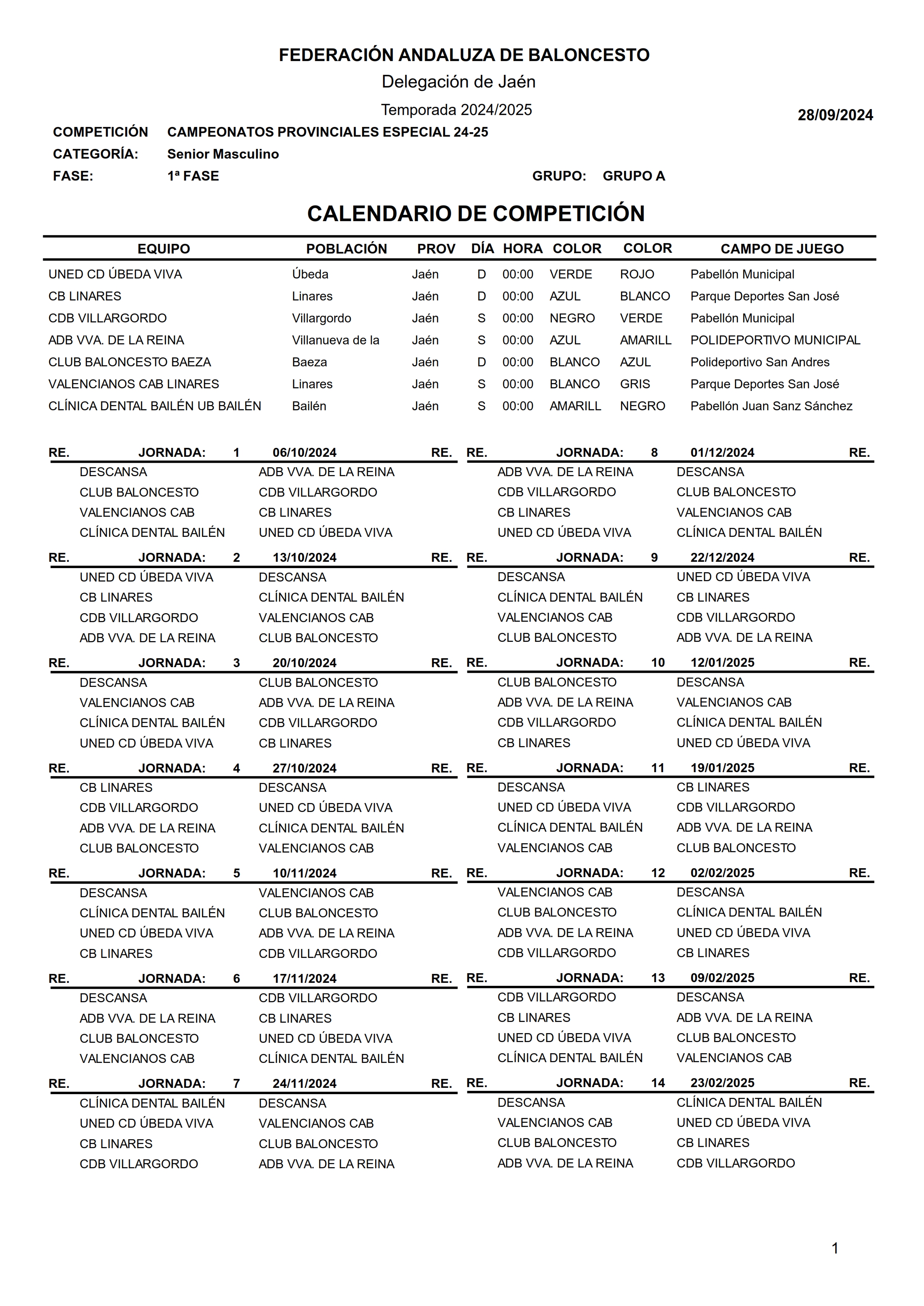 Calendario Liga Provincial Senior Masculino 2024/2025