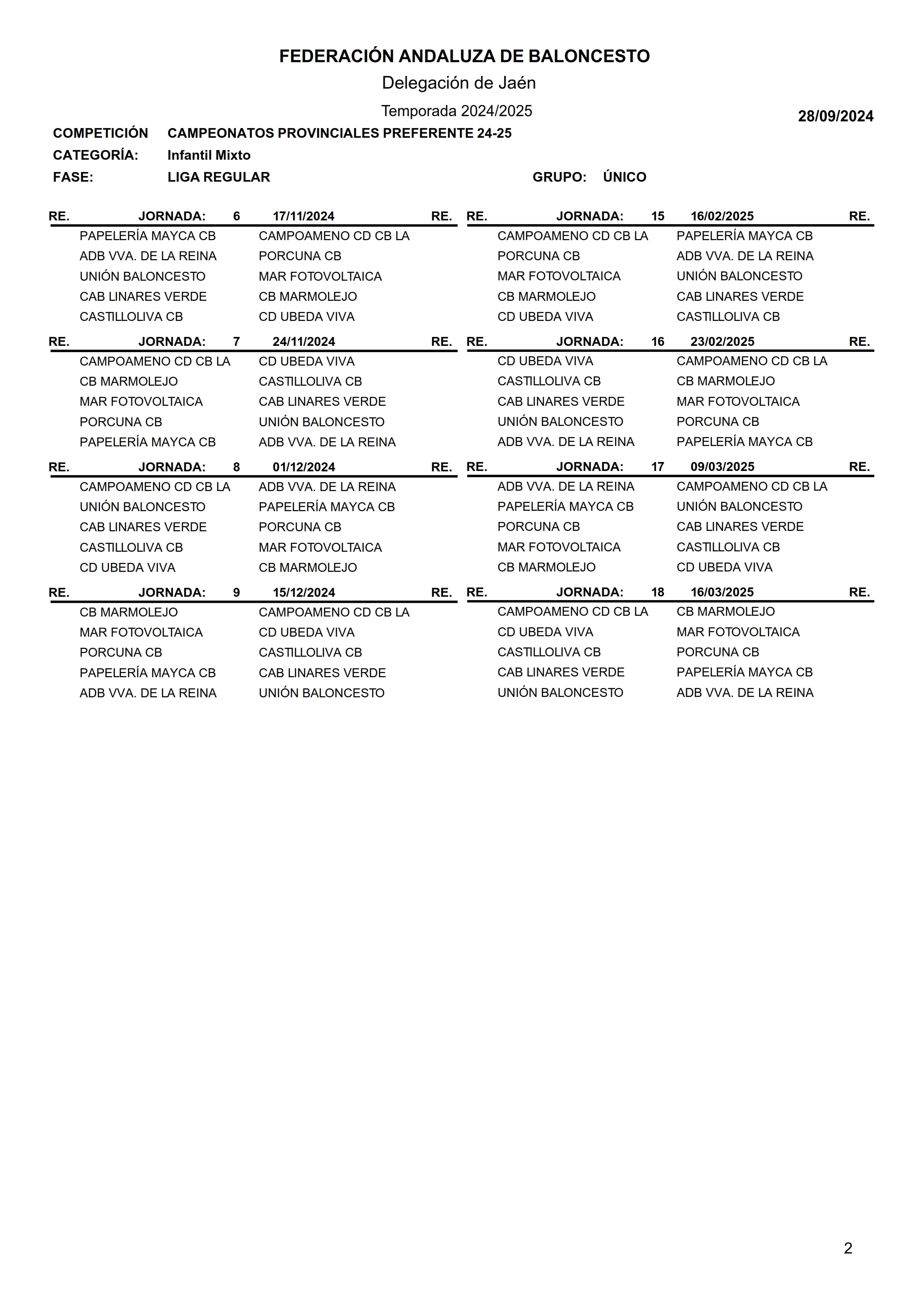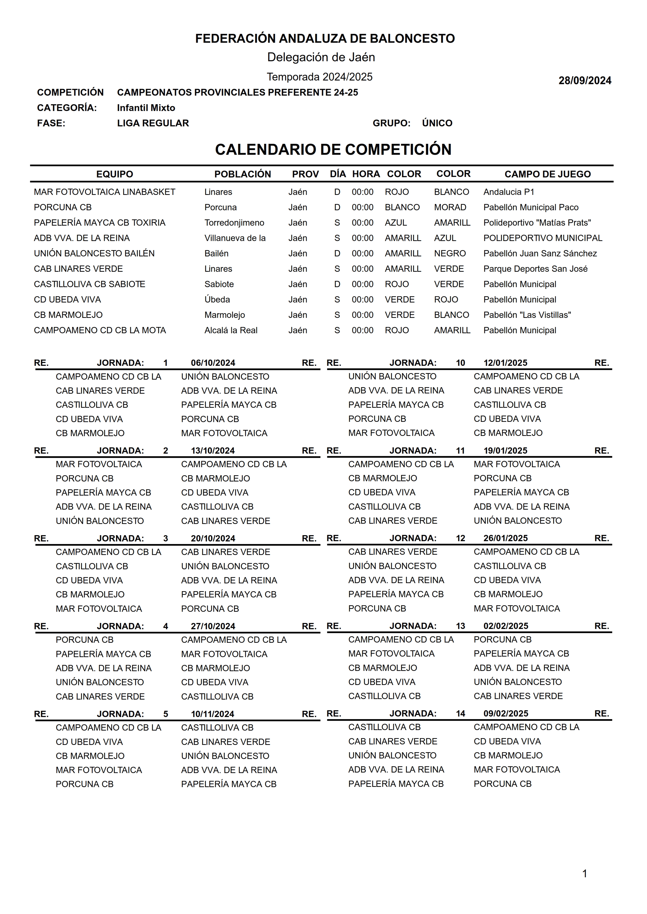 Calendario Liga Provincial Infantil Mixto 2024/2025
