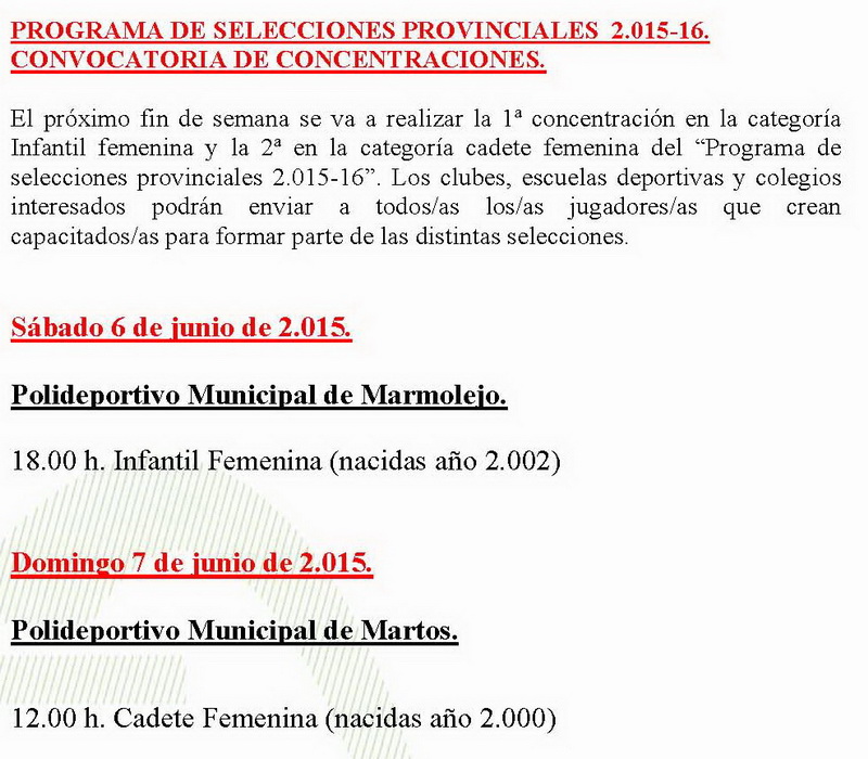 Programa de Selecciones ProvincialesSábado 06 junioInfantil FEMDomingo 07 junioCadete FEM |