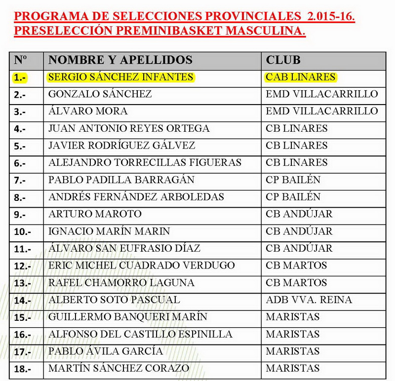 El próximo fin de semana continúa el proceso de selección de jugadores y jugadoras para las selecciones baby provinciales. Tras una primera preselección, el equipo masculino ha quedado reducido a dieciocho jugadores que se concentrarán el domingo a las 17:00 en La Garza (Linares) para realizar una sesión de entrenamiento y disputar un partido ante un equipo mini femenino.