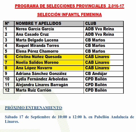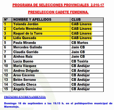 Programa de Selecciones ProvincialesCAD-MAS 17/09 ANDÚJARCAD-FEM 18/09 MARMOLEJOINF-MAS 18/09 TORREDONJIMENOINF-FEM 17/09 LINARESINF-FEM 18/09 MARMOLEJO |