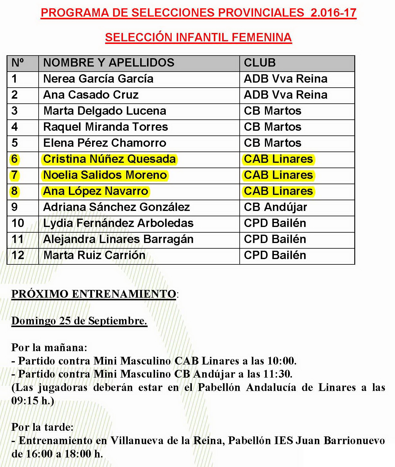 - INFANTIL FEMENINO Domingo 25/09/16 a las 09:15 en Linares (Pabellón Andalucía) y a las 16:00 Pabellón IES Juan Barrionuevo de Villanueva de la Reina.