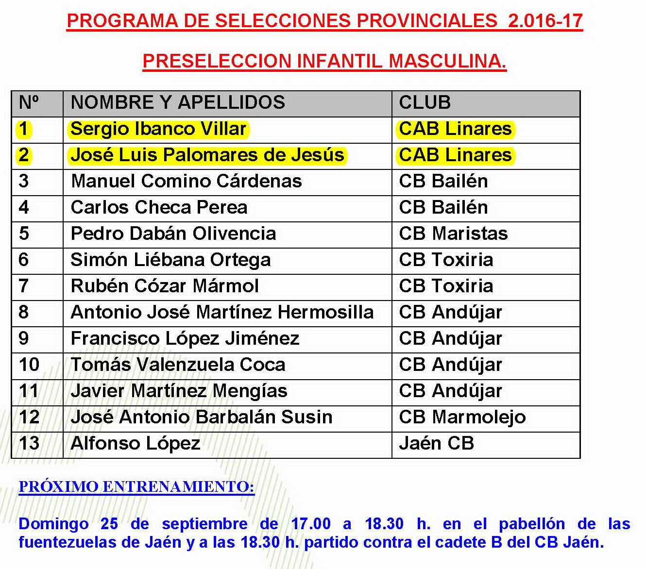 Tras las concentraciones del pasado fin de semana, poco a poco se van perfilando las selecciones provinciales que representarán a la Delegación Provincial en los Campeonatos de Selecciones Autonómicas. En el caso de la infantil femenina afrontan su segunda convocatoria con el equipo cerrado y en las demás, salvo en mini, que aún realizan convocatorias abiertas en masculino y en femenino, las listas de convocados/as son ya muy reducidas. Desde CAB Linares les deseamos a los deportistas de nuestro club que aspiran a mantenerse en ellas mucha suerte.