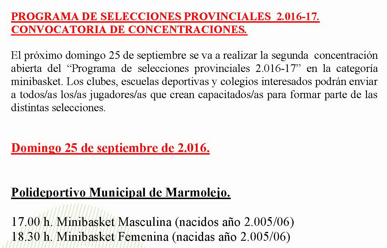 - MINIBASKET MASCULINO Y FEMENINO Domingo 25/09/16 a las 17:00 h masculino y 18:30 femenino en el Pabellón Municipal de Marmolejo