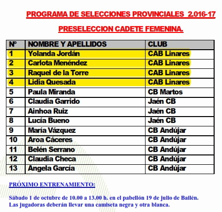 Continua este sábado la preparación de la preselección cadete femenina que se concentrará en Bailén con la siguiente lista de convocadas: