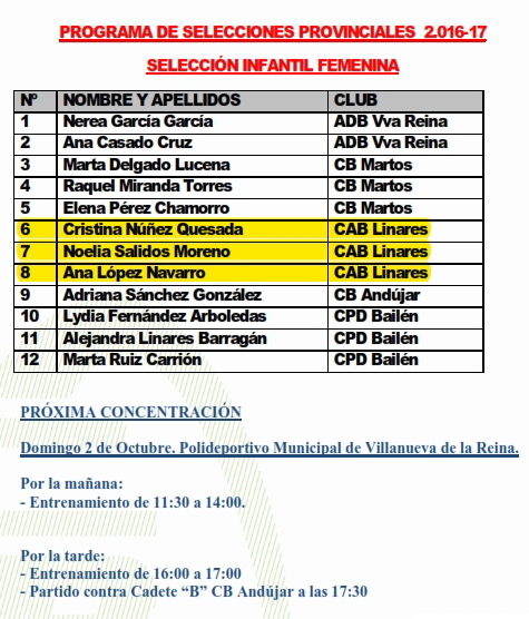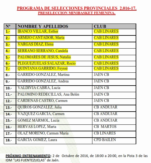 Tras las concentración del pasado fin de semana en Marmolejo se realiza convocatoria para sesión de entrenamiento para el próximo domingo de la preselección mini femenina a las 18:00 h en las instalaciones de Las Fuentezuelas de Jaén con la siguiente lista de jugadoras convocadas: