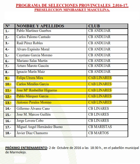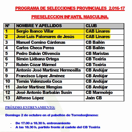 La preselección infantil masculina se concentrará en Torredonjimeno el domingo, ya con sólo un descarte por realizar, con la siguiente lista de convocados: