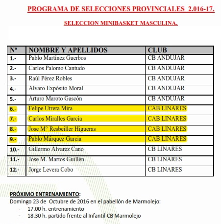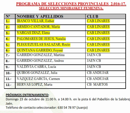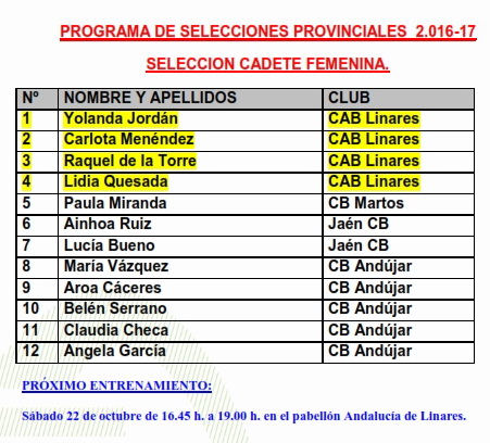 Programa de Selecciones ProvincialesCAD-FEM 22/10 LINARESINF-MAS 23/10 ANDÚJARMINI-MAS 23/10 MARMOLEJOMINI-FEM 23/10 JAÉN |