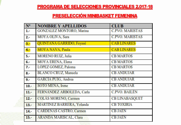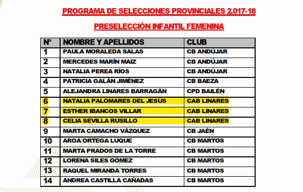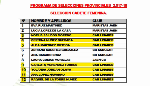 El comité técnico de la Delegación Territorial de Jaén de la FAB ha hecho públicas las convocatorias del Programa de Selecciones Provinciales para el próximo fin de semana. Destaca entre ellas la selección cadete femenina, en la que ya se ha concluido el proceso de selección de jugadoras y que nos llena de orgullo al estar incluidos en ella siete jugadoras de nuestro club.