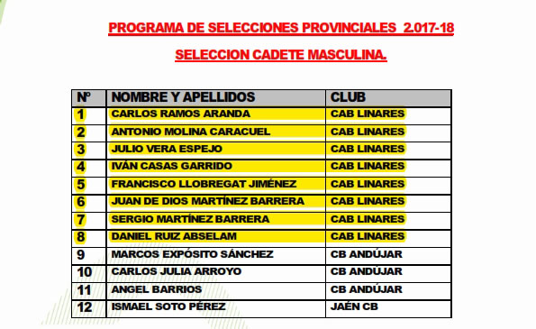 Selección CAD-MAS - Jaén 24/09/17Preselección CAD-FEM - Andújar 24/09/17Preselección INF-MAS - Andújar 24/09/17Preselección INF-FEM - Martos 24/09/17Preselección MIN-MAS - Marmolejo 24/09/17Preselección MIN-FEM - Jaén 24/09/17 |
