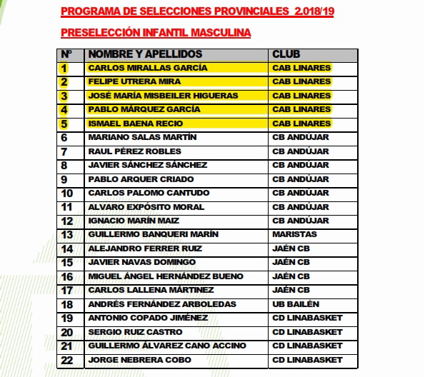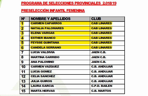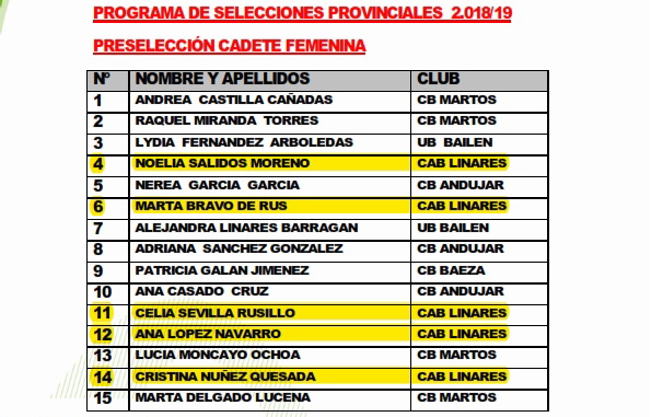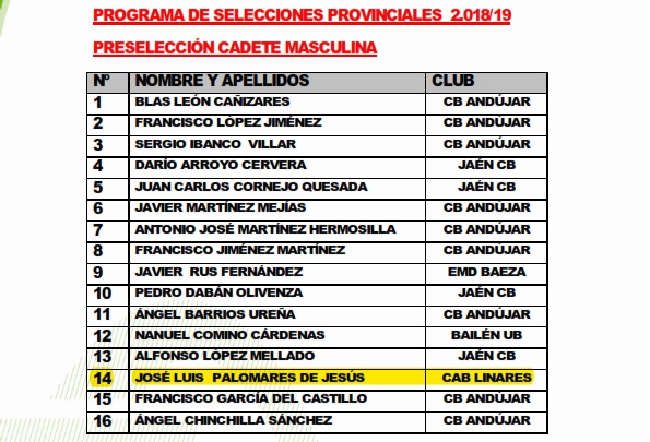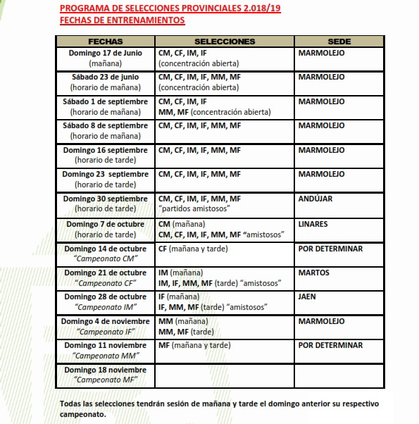 El Departamento Técnico de la Delegación Provincial de la FAB en Jaén dentro del Programa de Selecciones Provinciales 18-19 ha realizado una convocatoria para las categorías minbasket, infantil y cadete, tanto en la modalidad masculina como para la femenina, en el Pabellón Municipal de Marmolejo para el próximo sábado día 1 de septiembre. En el caso de la categoría minibasket se trata de la segunda convocatoria abierta, en la que todos los clubes, escuelas deportivas y colegios podrán enviar a todos aquellos deportistas que estimen oportuno. En el caso de las categorías infantil y cadete se trata ya de la tercera concentración y están convocados los deportistas que aparecen en los listados de preseleccionados que se muestran más abajo.