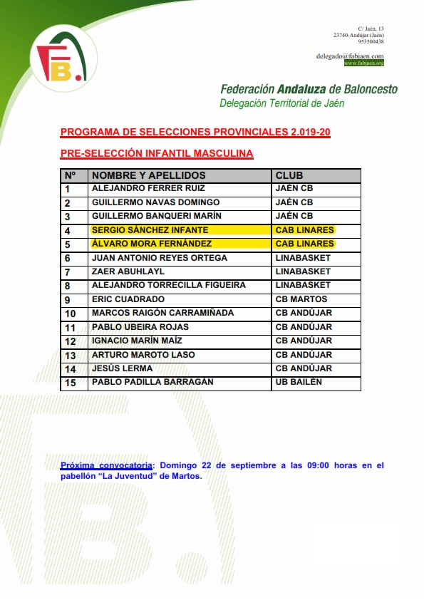 - Infantil masculina: Domingo 22 de septiembre a las 9:00 h Pabellón de Martos.