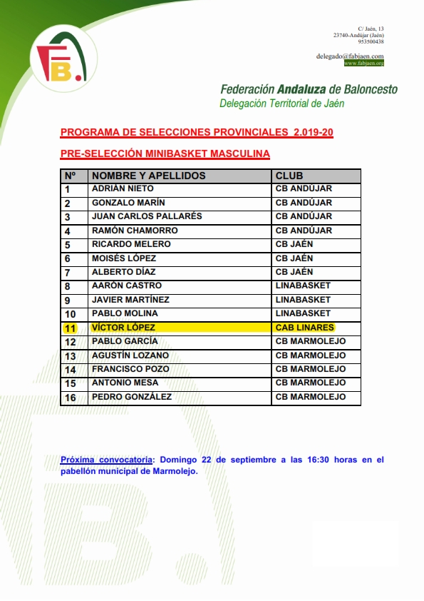 - Minibasket masculino. Domingo 22 de septiembre a las 16:30 h en el Pabellón de Marmolejo