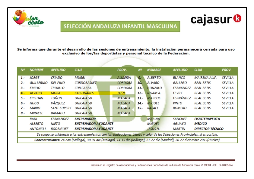 Nueva convocatoria de selecciones andaluzas y nuestro jugador Álvaro Mora continúa en el listado de preseleccionados en la categoría infantil masculina, que se concentrará el próximo domingo día 24 de noviembre en la Ciudad Deportiva de Carranque en Málaga.