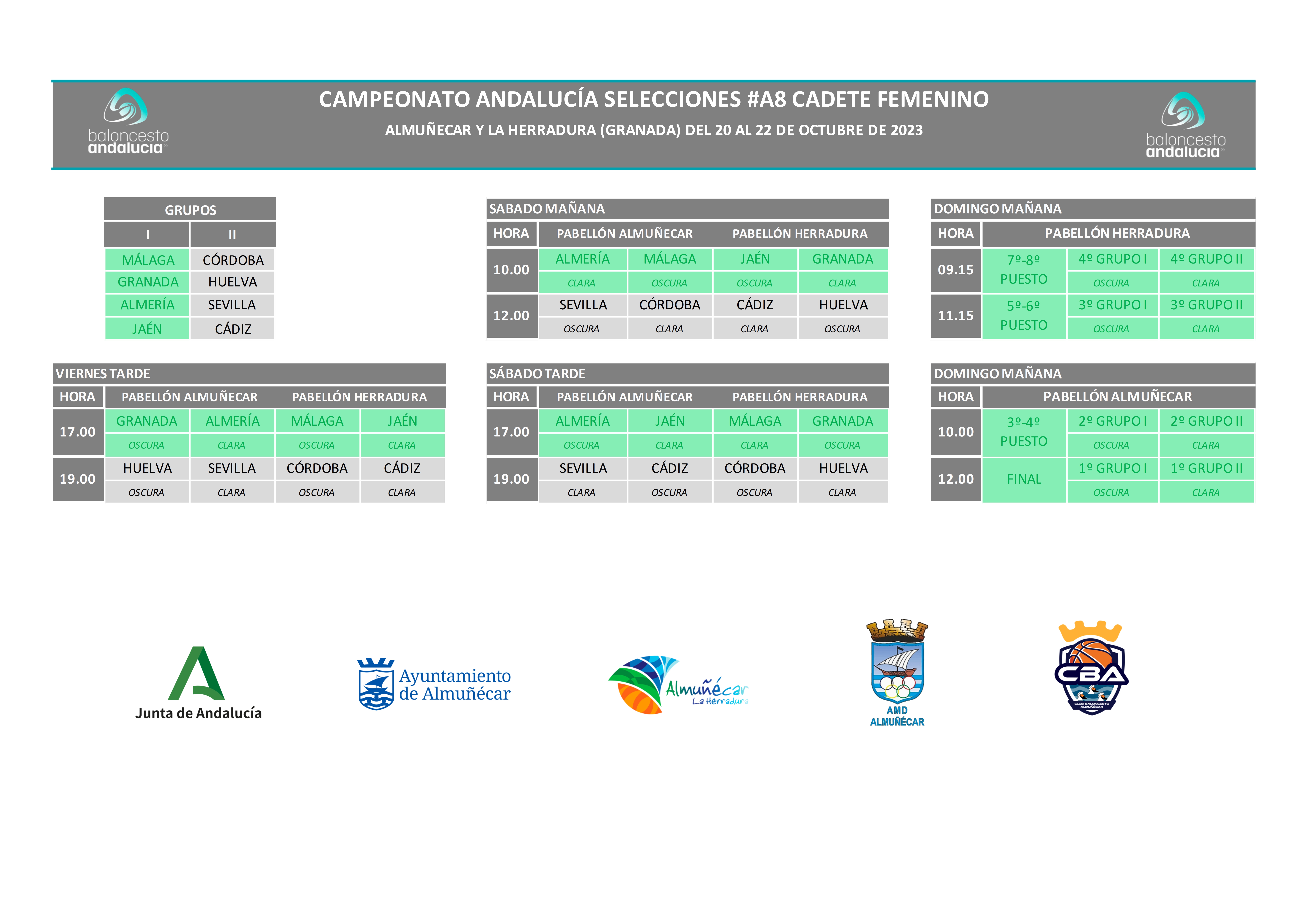 El combinado provincial ha quedado encuadrado dentro del grupo I junto con las representantes de Málaga, Granada y Almería. El viernes en el primer turno de la tarde el debut ante la delegación malagueña en La Herradura. El sábado por la mañana mismo escenario para enfrentarse a Granada y cierran la jornada de grupos en la jornada vespertina en Almunécar ante Almería. El domingo, en función de la clasificacion en la fase de grupos jugarán el último partido para dilucidar el puesto final en el campeonato.