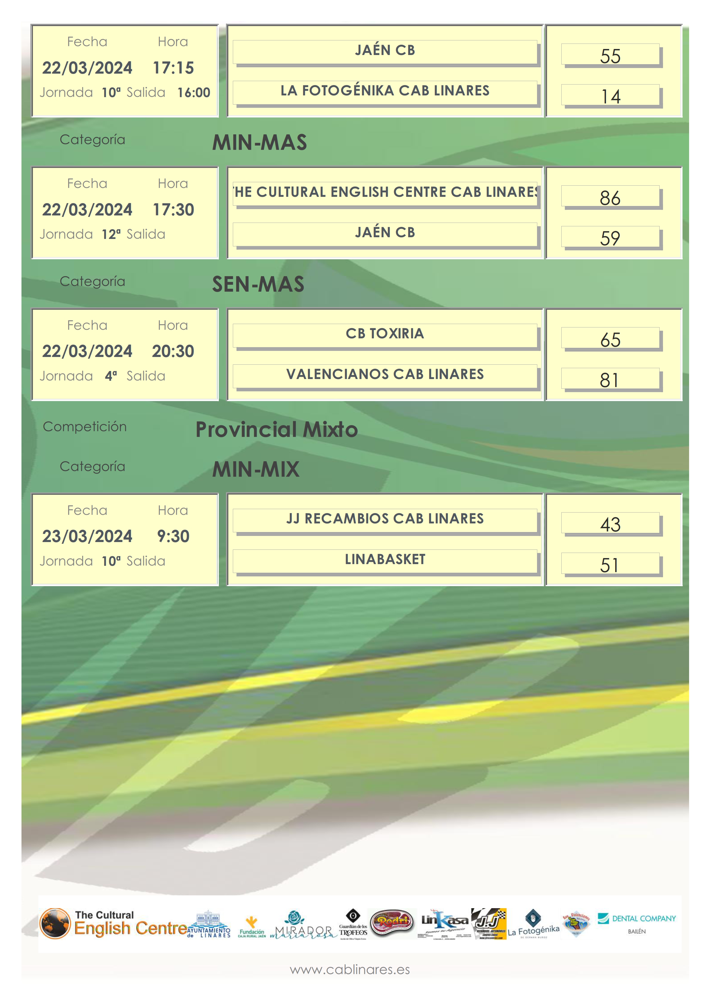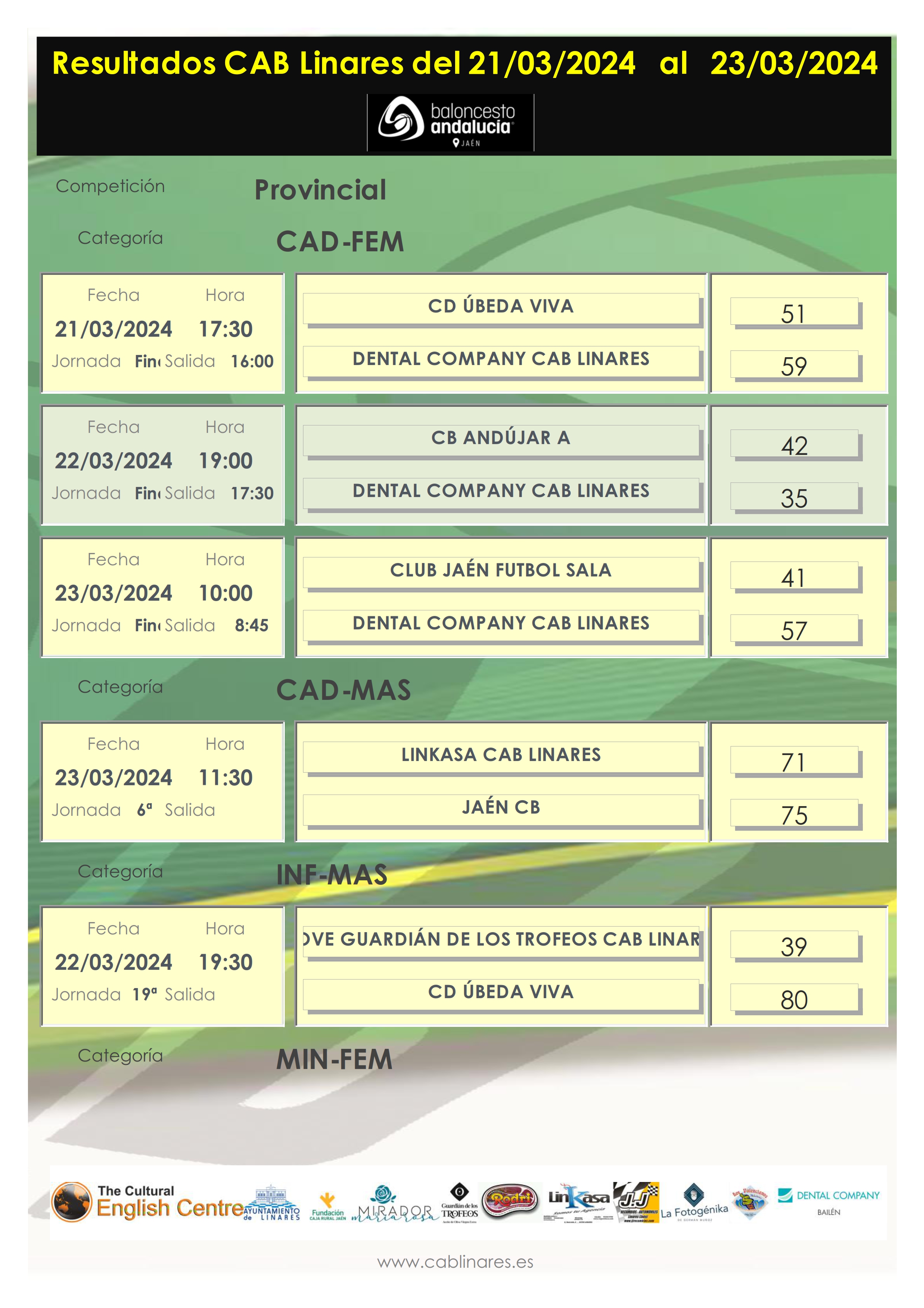 El viernes por la tarde el mini femenino, La Fotogénika CAB Linares, caía derrotado en su visita a Jaén CB. El mini masculino, The Cultural English Centre CAB Linares, en un partido que anduvo igualado en los primeros periodos, rompía la diferencia en el quinto ante Jaén CB, para hacerse con una cómoda victoria. A continuación el infantil masculino AOVE Guardián de los Trofeos CAB Linares caía derrotado ante CD Úbeda Viva. Cerraba la jornada de viernes el senior masculino, Valencianos CAB Linares, que vencía en su visita a CB Toxiria.