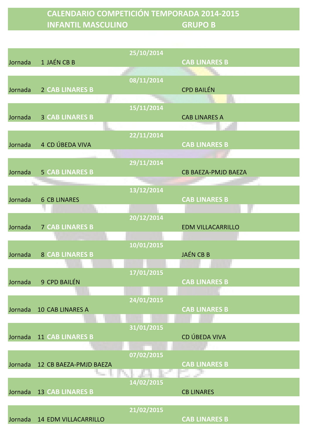 Calendario Infantil Masculino B webmaster Categoría: Infantil Masculino B 09 Octubre 2014 Visitas: 5102 Facebook X Anterior Siguiente
