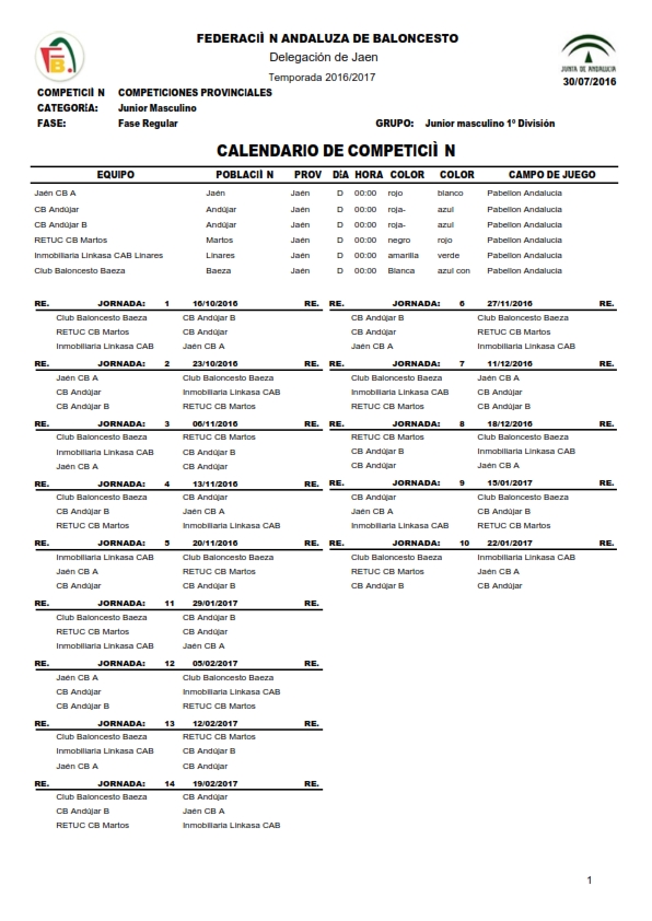 Calendario 1ª Nacional Femenina 2016/2017 webmaster Categoría: Calendarios 2016/2017 04 Agosto 2016 Visitas: 4203 Ya está disponible el calendario para la próxima temporada en la competición de 1ª División Nacional Femenina Leer más…... Calendarios 1ª División Provincial 2016-2017 webmaster Categoría: Calendarios 2016/2017 30 Julio 2016 Visitas: 4086 Leer más…...