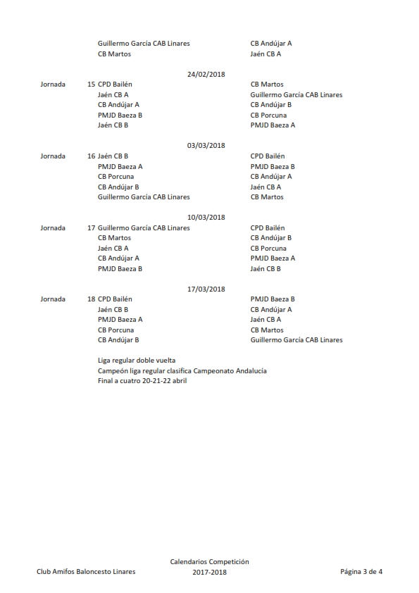 Sistema de competición liga regular a doble vuelta. Los cuatro primeros clasificados de la liga regular disputan Fase Final en la localidad del primer clasificado los días 11/02/18 sábado, 17/02/18 viernes y 24/02/18 viernes. El campeón de la liga regular clasifica directamente para el Campeonato de Andalucía de la categoría.